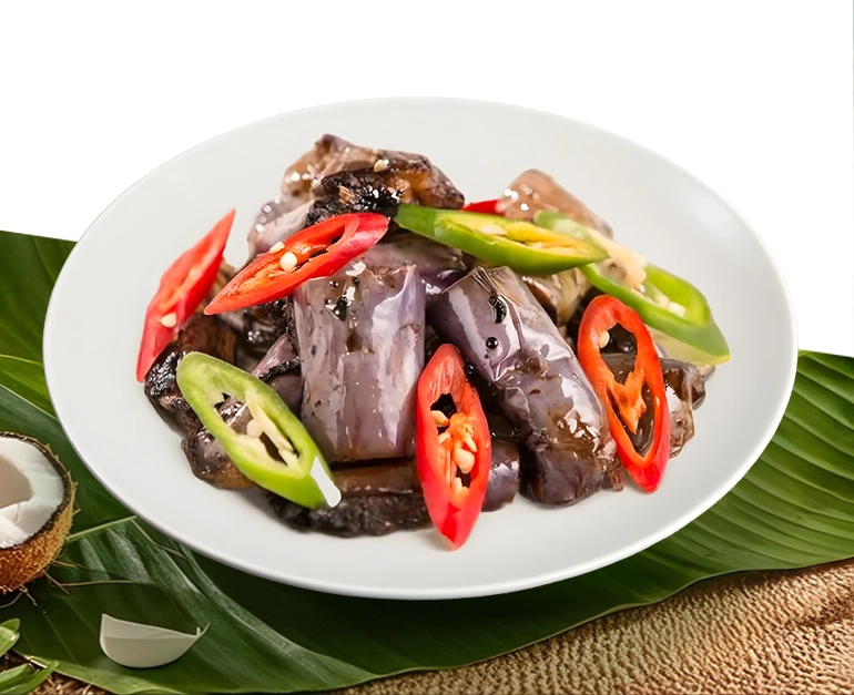 Stir-fried eggplant has a tender – soft texture, carrying a mild, earthy flavor enhanced by savory seasonings, making for a simple yet satisfying taste.
