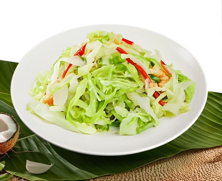 The stir-fried cabbage with dried shrimps combines the fresh crunch of cabbage and the savory, briny punch of shrimps, offering a light, refreshing yet flavorful bite.